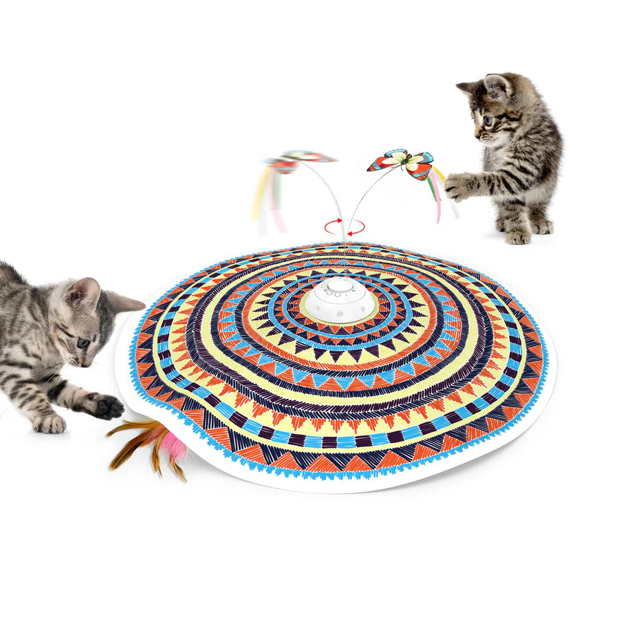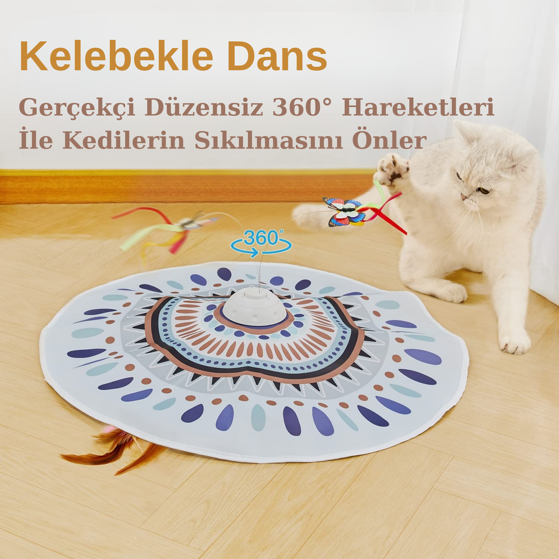 Üst kısımdaki kelebek, 360° dönüş hareketleriyle kedinizin dikkatini çeker ve zıplamasını, yakalamaya çalışmasını sağlar. Gerçek kelebek uçuşunu taklit eden bu hareket, avcılık içgüdüsünü tetikler ve enerjisini atmasına yardımcı olur.