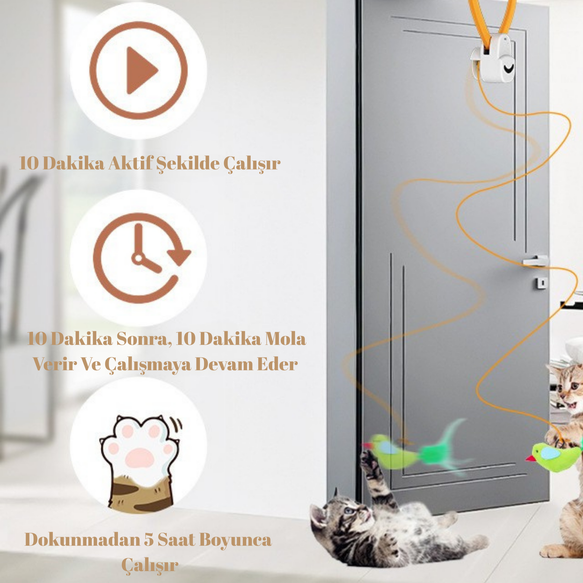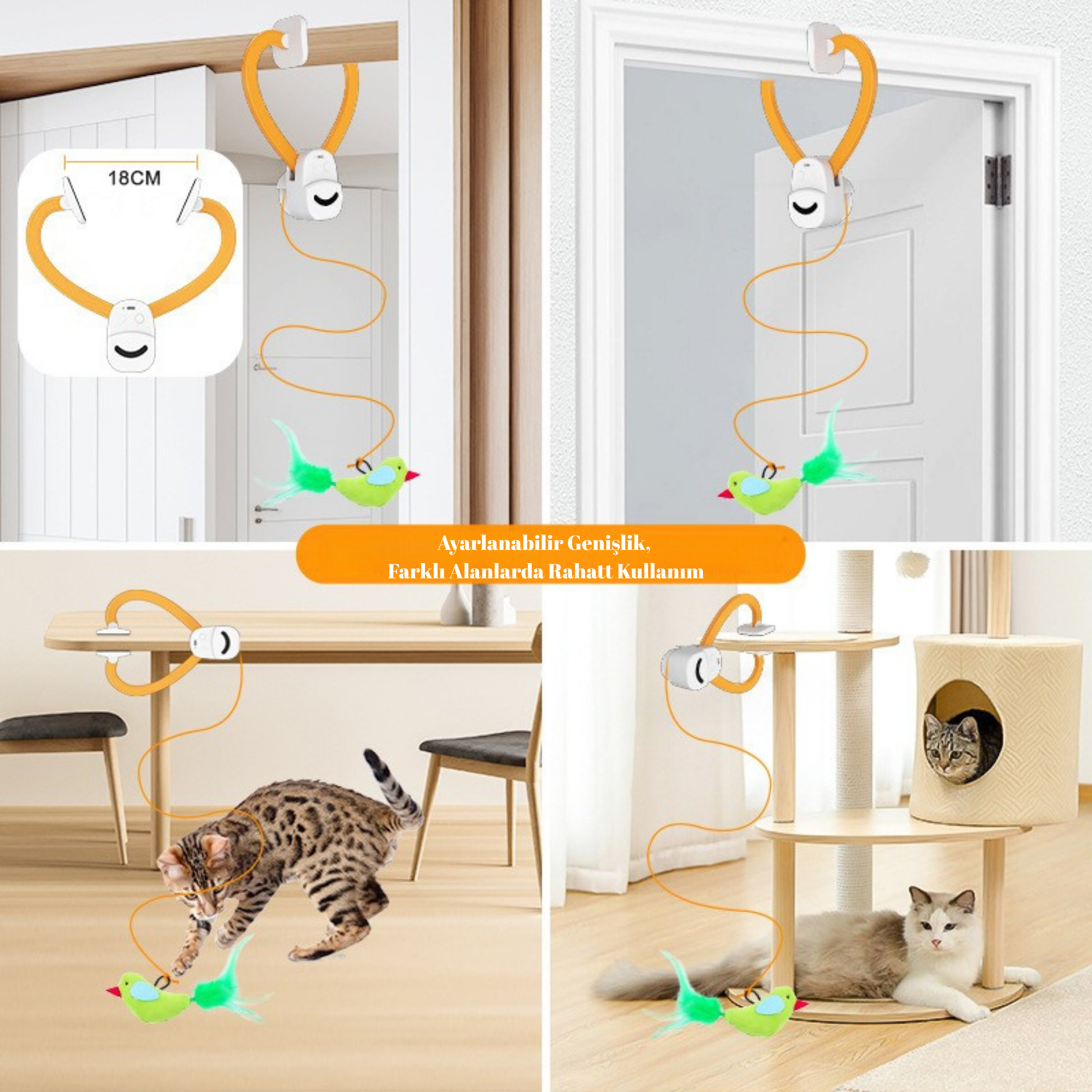 Kurulum derdi yok! ⏳ Hafif ve esnek tasarımı sayesinde kapı üstü, masa kenarı gibi birçok farklı noktaya kolayca takılır. 🔧 Şarjlı yapısı sayesinde kablo karmaşasına son verin. İster evde ister ofiste, birkaç saniyede kurun, kediniz anında eğlenceye başlasın. 🏠📍